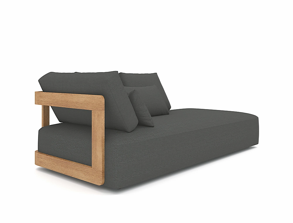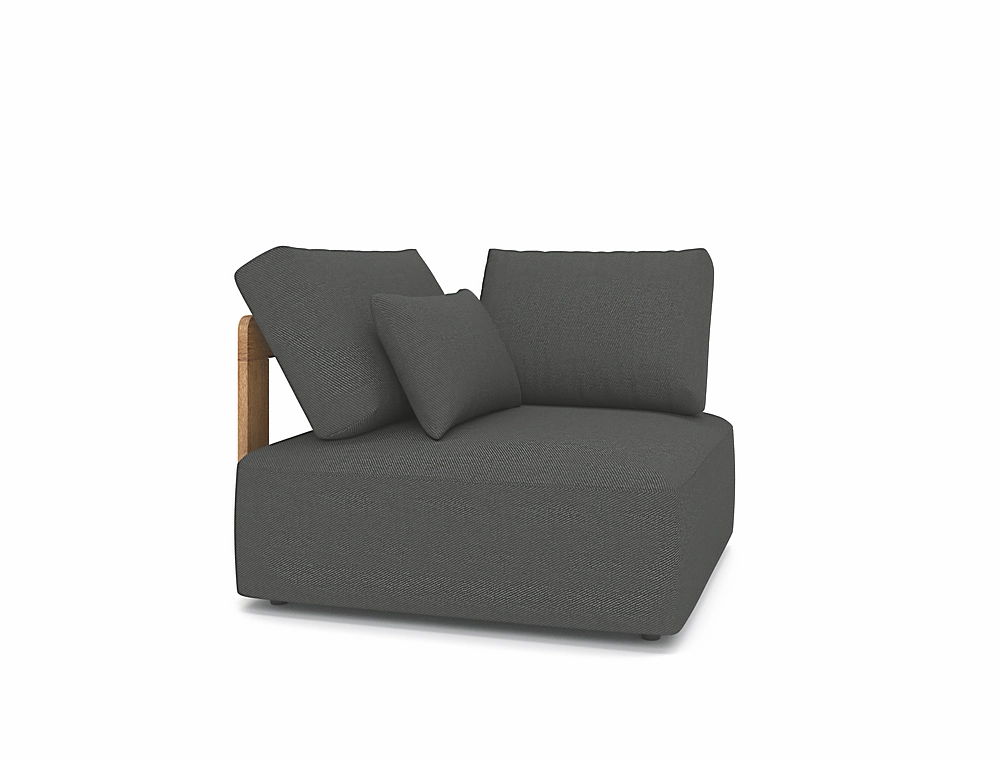 Le salon de jardin est disponible en trois finitions : structure en teck avec un revêtement en tissu gris anthracite, structure en teck avec un revêtement en tissu écru et structure en aluminium avec un revêtement blanc.